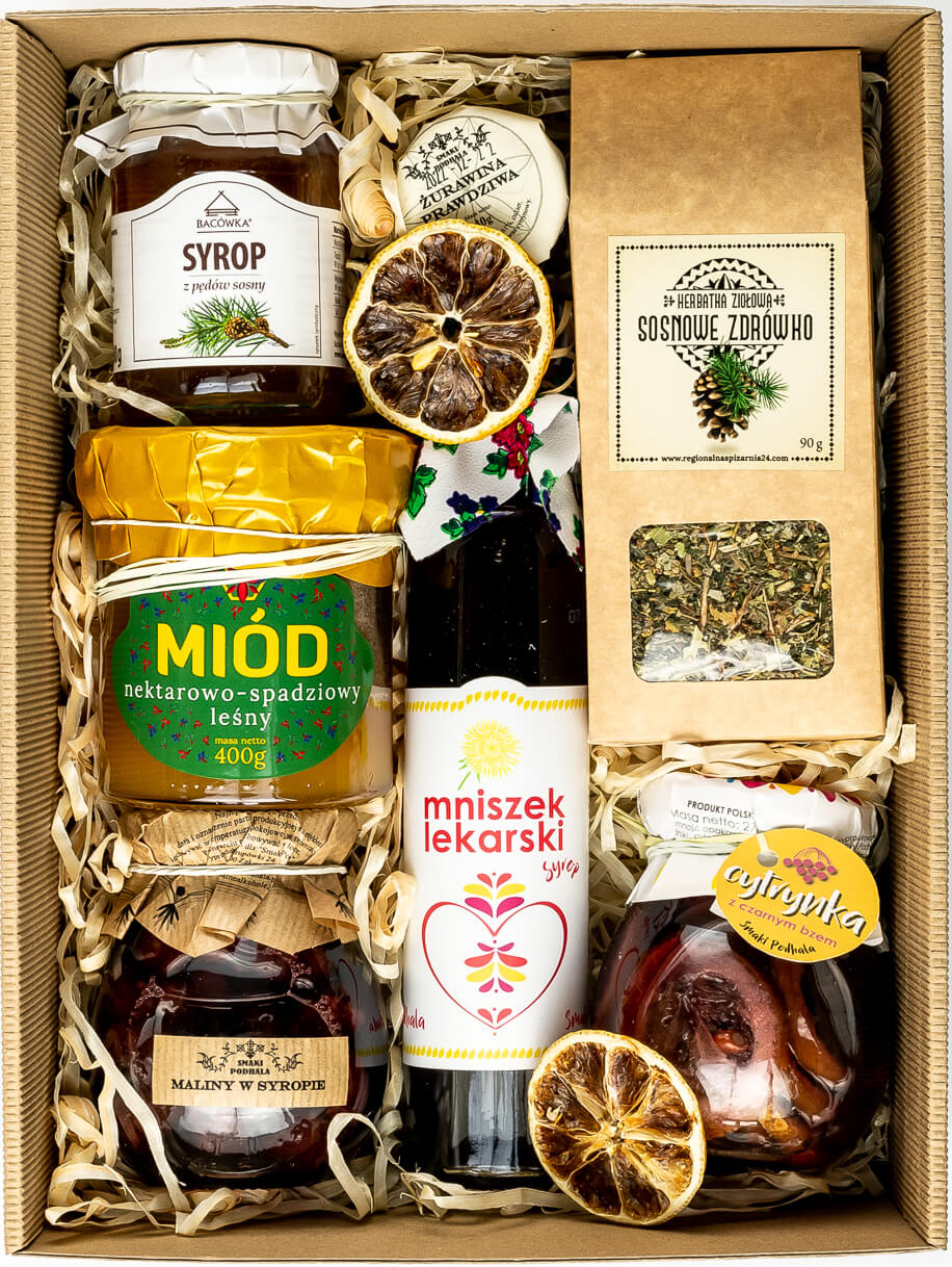 Zestaw skomponowany z produktów wzmacniających odporność organizmu. Świetnie sprawdzi się w okresie jesienno-zimowym. Produkty zapakowane w pudełko z szybką wraz z siankiem w środku.