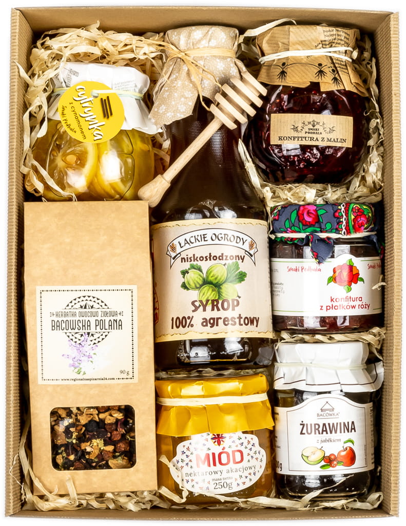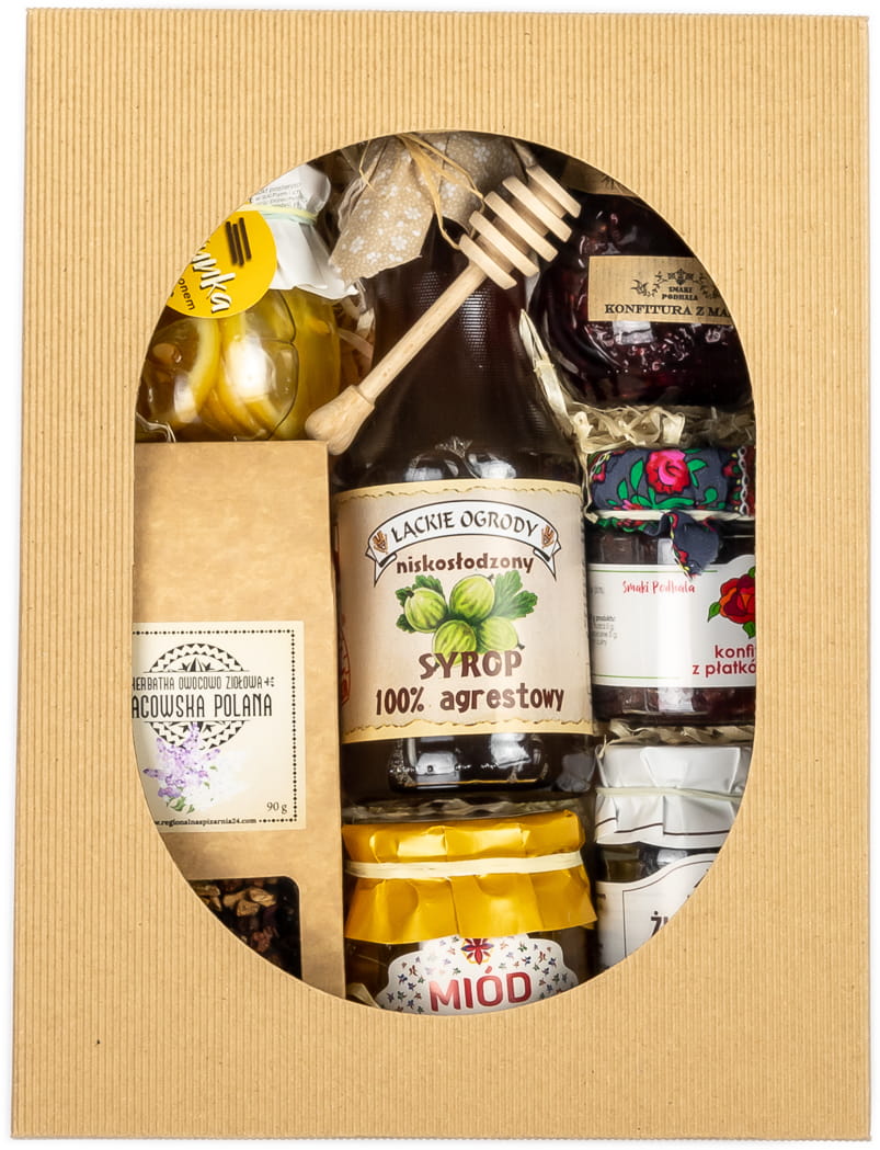 Produkty zapakowane w pudełko z szybką wraz z siankiem w środku.
